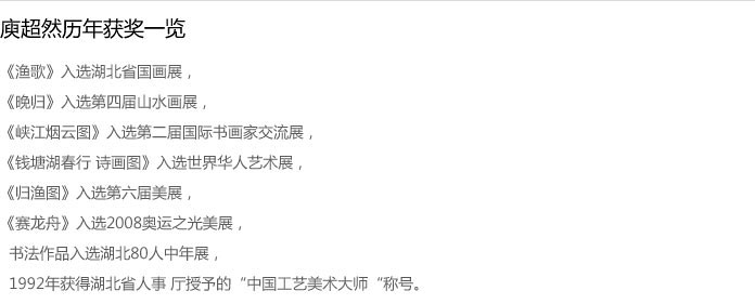 作品《漁歌》入選湖北省國畫展,《晚歸》入選第四屆山水畫展,《峽江煙云圖》入選第二屆國際書畫家交流展,《錢塘湖春行 詩畫圖》入選世界華人藝術展,《歸漁圖》入選第六屆美展,《賽龍舟》入選2008奧運之光美展,書法作品入選湖北80人中年展,1992年獲得湖北省人事 廳授予的“中國工藝美術大師“稱號。