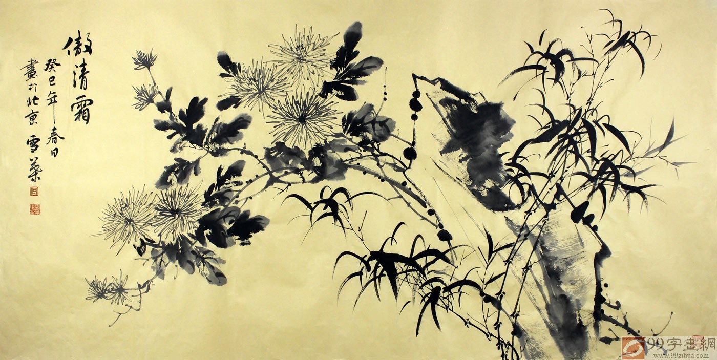 【作品簡評】(99字畫網(wǎng)藝術評論員路豐)這幅《傲清霜》花鳥畫是當代著名畫家何華賢老師的作品,此幅作品畫面清新自然,簡潔雅趣,淡淡的水墨暈染與巧妙而又嚴謹?shù)墓P墨勾勒,使得畫中秋菊盎然、端莊秀麗,墨竹盡顯挺拔頑強,同時又流露出一種桀驁不屈的謙謙君子之情,是一幅唯美雅趣的精品寫意竹菊圖!