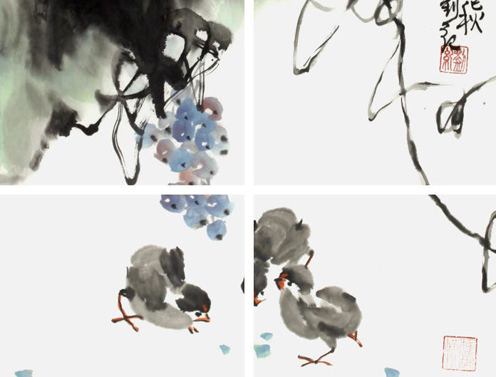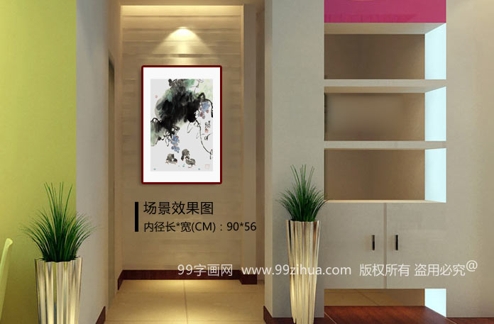 【作品簡評】 (99字畫網藝術評論員曉曼)此幅豐收碩果吉祥畫,繪一墨韻酣暢的葡萄架下,兩串葡萄自由垂落的場面,葡萄水分充分,粒粒豐盈,藤蔓墨韻非凡,纏繞其中,藤蔓下勾勒出三只小雞,在尋覓著葡萄,這種既溫馨又祥和的畫面躍然其中,是大家心目中所要追求的溫馨場面,寓意豐收的喜悅、吉祥的幸福等,是玄關字畫、走廊字畫之選,推薦選購!