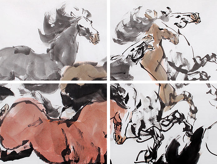 【作品簡評】(99字畫網藝術評論員曉曼)此幅八駿圖《八駿呈祥》,繪八匹駿馬凌空飛騰、奔跑疾速,邁著矯健的步伐,身姿俊美,別具風姿。在王向陽先生的筆下,他將駿馬的軀干、四肢、腿蹄酣暢淋漓地繪之于畫幅中,一路飛馳向前,將八匹駿馬瞬間的動作巧妙地繪之其畫,體現出奮發向上、豪邁進取的精神,體現中國人志氣、拼搏的進取精神,乃精品畫作!