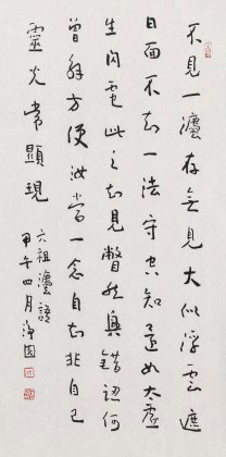 張德林積極響應了近年來藝術界“回歸”的號召,又從書法的廣闊藝術形式與思想中最終選擇并實現了融禪道思想于書法技藝與精髓的道路,內外并舉,不僅在深厚的書法底蘊上形成了獨具魅力的筆體,更從中體現了佛家思想的博大精深。著名藝術評論家陳傳席稱贊張德林的書法“圓渾高古,秀骨沉靜”,從藝術和思想上做了雙重的肯定。另外一位書法評論家傅德鋒則對張德林的書法體做了具體的描述,他評價張德林“風格最大的特點就是線條凝練而不浮滑,點畫精到而富于變化,章法渾融而不顯板滯,氣息古雅而耐人品讀”。概括起來,正如張德林的法號“凈圓”,“凈”為氣,主內;“圓”為形,主外。內外融會貫通,形成了今天在九千堂美術館展出的40余幅作品。